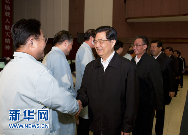 在北京航天飛行控制中心飛控大廳,胡錦濤等領導同志同現場工作人員一道為發射成功熱烈鼓掌,向他們表示祝賀和慰問。胡錦濤總書記特別叮囑大家,一定要大力發揚載人航天精神,更加精心細致地做好各項工作,確保我國首次空間交會對接任務圓滿成功。