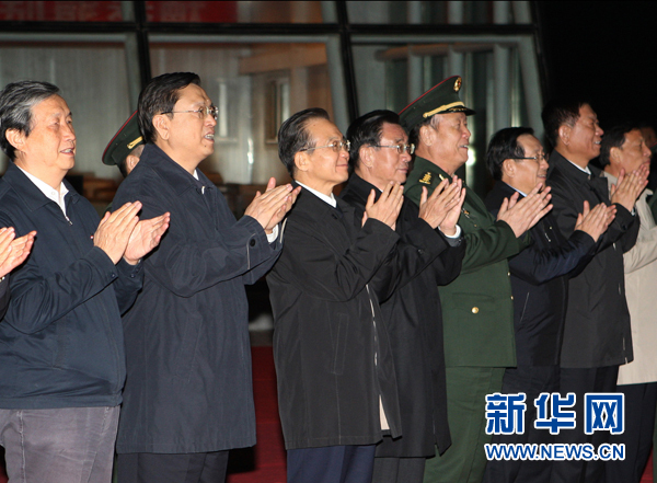 與此同時,溫家寶等領導同志來到酒泉衛星發射中心的試驗指揮樓平臺,現場觀看發射。溫家寶等領導同志是29日晚抵達酒泉衛星發射中心的。在發射中心,溫家寶等領導同志召開會議,有關方面匯報了天宮一號飛行任務準備情況。溫家寶說,近三年來,全體參研參試部門和單位,堅決貫徹中央的指示和要求,密切配合、協同作戰,各項工作周密細致、卓有成效;全體參研參試人員,牢記使命、攻堅克難,突破了一批核心關鍵技術,圓滿完成了各種產品的研制和測試。溫家寶指出,突破和掌握空間交會對接技術,是實現載人航天“三步走”戰略目標的重要步驟。天宮一號飛行任務是整個交會對接的基礎。希望同志們精益求精地做好各項工作,圓滿完成天宮一號發射任務,并做好在軌測試和管理工作,打贏交會對接的關鍵之戰。